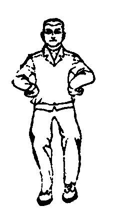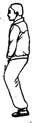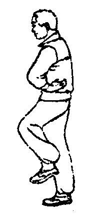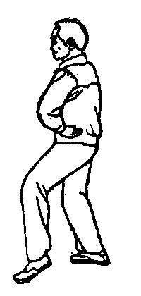 自由步是走动的一种。上身及其它要领同前,两手背撑腰,走时两腿同时弯曲,两膝似向下跪,腿部肌肉放松,随势沉气,一脚平起,抬至踝上如(图六),然后平落于前脚尖内侧,两腿微直,但仍保持一定的曲度,如此反复迈步前行。步法要慢,速度要匀。练功结束时双手放下,缓缓散步而止。