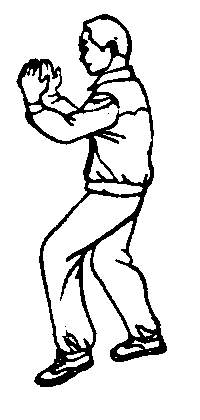 度,前脚放正,足跟抬起。前腿负体重十分之四,后腿十分之六,切实做到混元一气的要求。如(图四)。换步时前脚跟落地,足尖外展,后脚上步,平起平落,如此反复换步。两手抬起,手心先向内,后翻转朝前,如(图五),最后两手背撑腰,复归(图四)动作,即可接作走动。