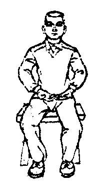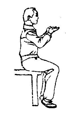 坐同走、站基本要领一致。坐于凳上,两脚平行,距同胯宽,两臂下垂,手背放于躯干和下肢曲折部位的小腹前,手心朝上,静松调息如(图七)。入静后将两足跟抬起寸许,涌泉着地,不可用力,自然呼吸,待两腿发动(均匀地颤动)肘,即将两臂抬起,手心向内,如(图八),切实掌握静、松与混元一气的要求,复将两手翻转,手心朝前。持内气调和,心神相依,再将两手背撑腰,足跟落地,左脚稍往后撤,缓缓起立,进入走功。